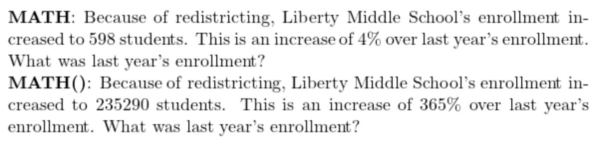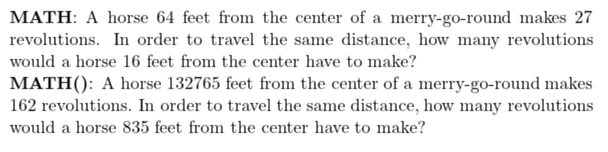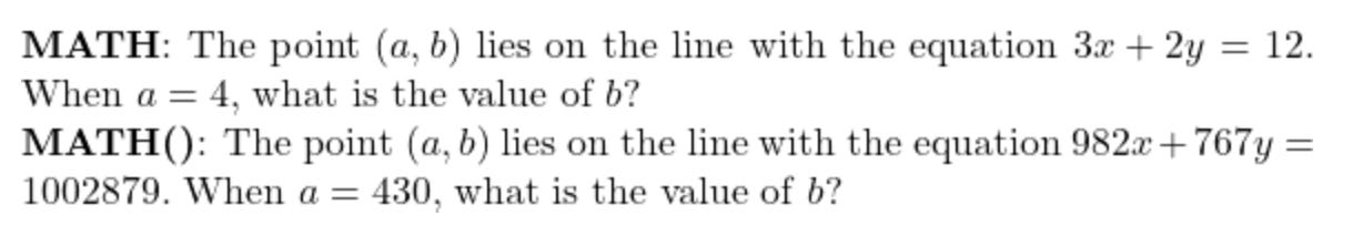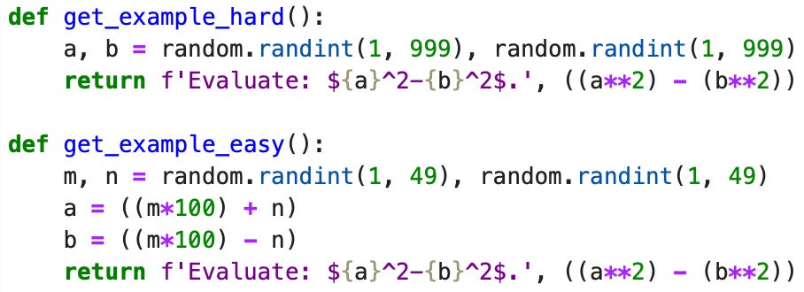 MATH() is a system for synthetically generating data, based on a static dataset called MATH. (As in the joke about the panda who eats, shoots and leaves, the extra punctuation makes the difference.) The original MATH dataset is a collection of maths problems with human-written solutions, including explanations of reasoning, intended for training and evaluating language models. To create MATH(), the authors wrote data generating code that used the static problems as templates. By replacing values in a MATH problem with random numbers, and then updating the resulting calculations, you can create endless new variations.