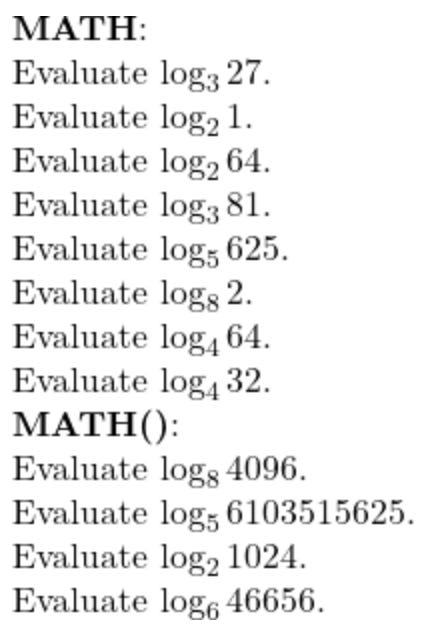 Apart from the obvious issues discussed above, in my observation, it seems like the random numbers used in MATH() are generally bigger or harder to deal with than their MATH originals. For example, take these level 1 problems from the two datasets: