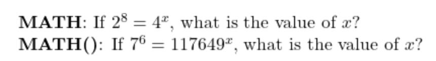 The MATH problem is quite easy if you know your times table, 2 * 2 = 4, and therefore 8 = 2x and x = 4. To apply a similar logic to the MATH() problem, you must know 117649 is 7 to the power 6.