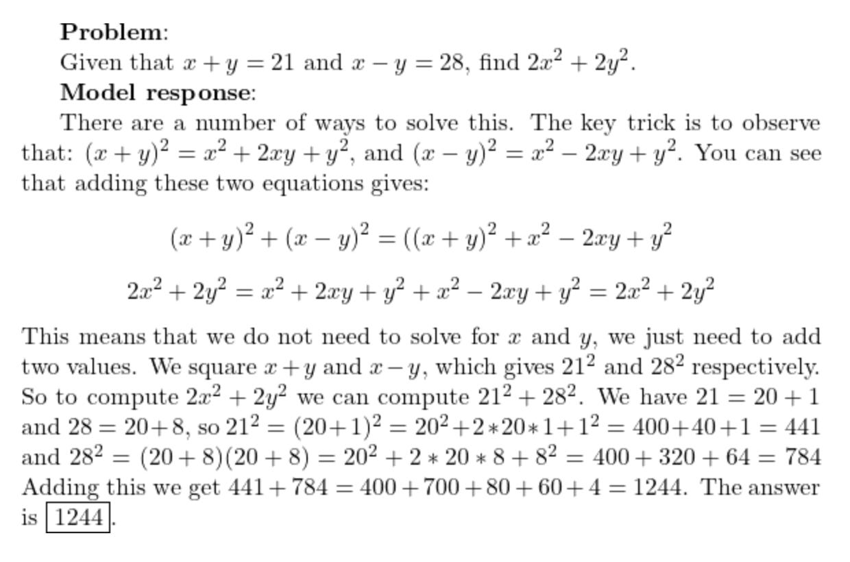 This attempted solution fails at the last step when trying to add 441 and 784. We see the model correctly applying a complex solution method, but failing due to an arithmetic error. (In contrast, the model trained on MATH data solves the problem in two lines, doing most arithmetic in one step.)